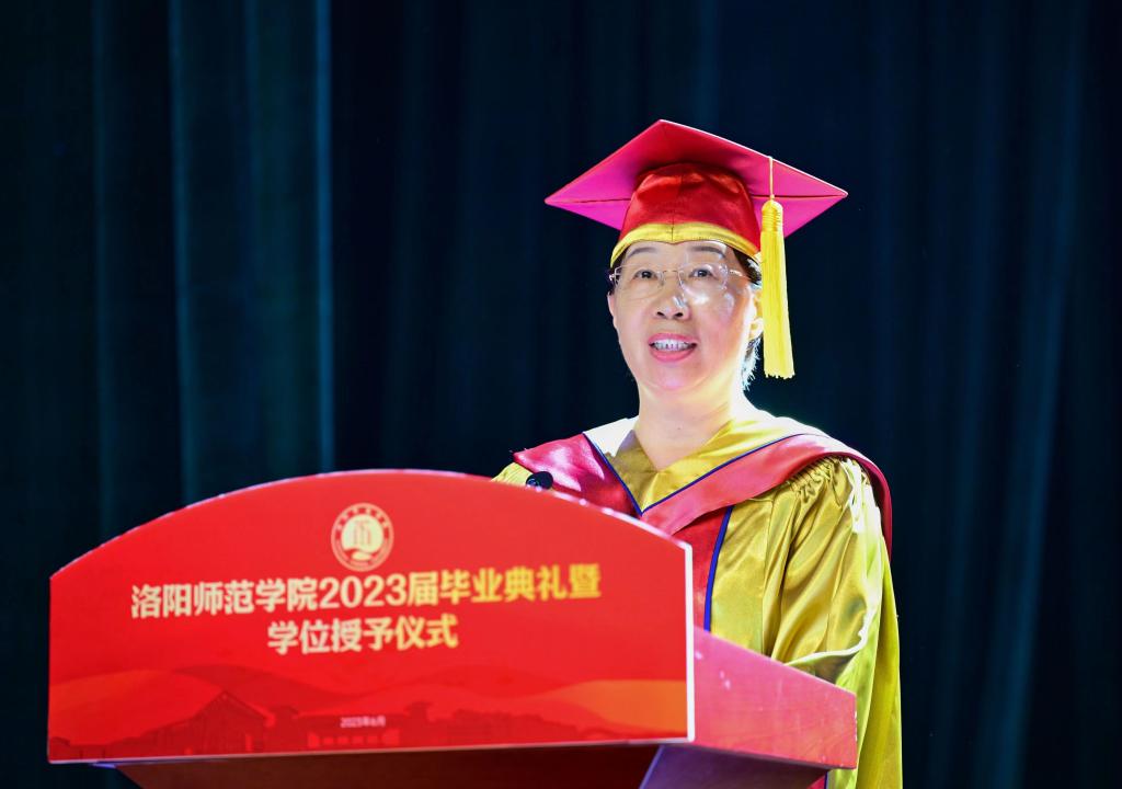 郭改英首先对2023届毕业生顺利完成学业表示热烈祝贺,同时回顾了同学们大学校园的点点滴滴。她谆谆寄语毕业生,同学们生逢伟大时代,拥有优越的发展环境、广阔的成长空间、建功立业的人生际遇,要在时代的坐标系中,思考未来发展的方向,以不负时代、不负韶华的青春之为,在全面建设社会主义现代化国家的火热实践中绽放绚丽之花。她勉励同学们要坚定信仰,始终心怀“国之大者”,践行好“请党放心、强国有我”的青春誓言,用脚步丈量祖国大地、用眼睛发现中国精神、用耳朵倾听人民呼声、用内心感应时代脉搏,把个人梦想融入实现中华民族伟大复兴的中国梦,在与党同心、与时代同行中弘扬志气、涵养骨气、厚积底气,在青春的赛道上跑出“最好一棒”;要锤炼坚毅品格,以豁达的心态直面人生的高潮与低谷,正确对待一时的成败得失,处优而不养尊,受挫而不短志,永葆一股旺盛的精力和斗志,永葆一颗向上乐观的心态,前方肯定是光明的坦途;要不断学习,保持终身学习的习惯和开放的心态,既要踏踏实实做学问,更要锲而不舍提升专业能力和认知水平,在不断学习中成就精彩人生;要拼搏奋斗,始终保持敢为人先的勇气担当和青春无悔的蓬勃力量,以坚守回应理想,以热爱回应磨难。她满怀深情地说:“不管未来如何,希望你们都不要停下奋斗步伐,满怀期待而又坚定地向前走去,以奋进的姿态,照亮前行之路、叩开幸福之门、奏响时代强音。”
