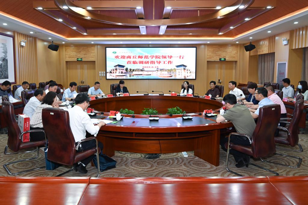 6月15日上午,商丘师范学院党委书记张志坚、校长陈向炜等一行来米兰app官方端网站入口考察调研。座谈会在成均楼B301会议室举行,校党委书记郭改英,党委副书记、工会主席李晓彦,副校长赵海彦、曹玉涛,党政办公室、人事处、研究生处、教务处、发展规划处、科研管理处、物理与电子信息学院、化学化工学院等相关负责人参加座谈。