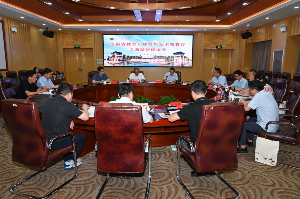 7月5日,省教育厅二级巡视员、研究生处处长曹克舜,省教育厅副总督学岳德胜和省教育厅一级主任科员杨超一行3人莅临米兰app官方端网站入口开展主题教育专题调研。调研座谈会在成均楼B301会议室召开,副校长赵邦屯,洛阳理工学院副校长黄志全,河南科技大学、洛阳理工学院和米兰app官方端网站入口相关部门负责人参加座谈交流。
