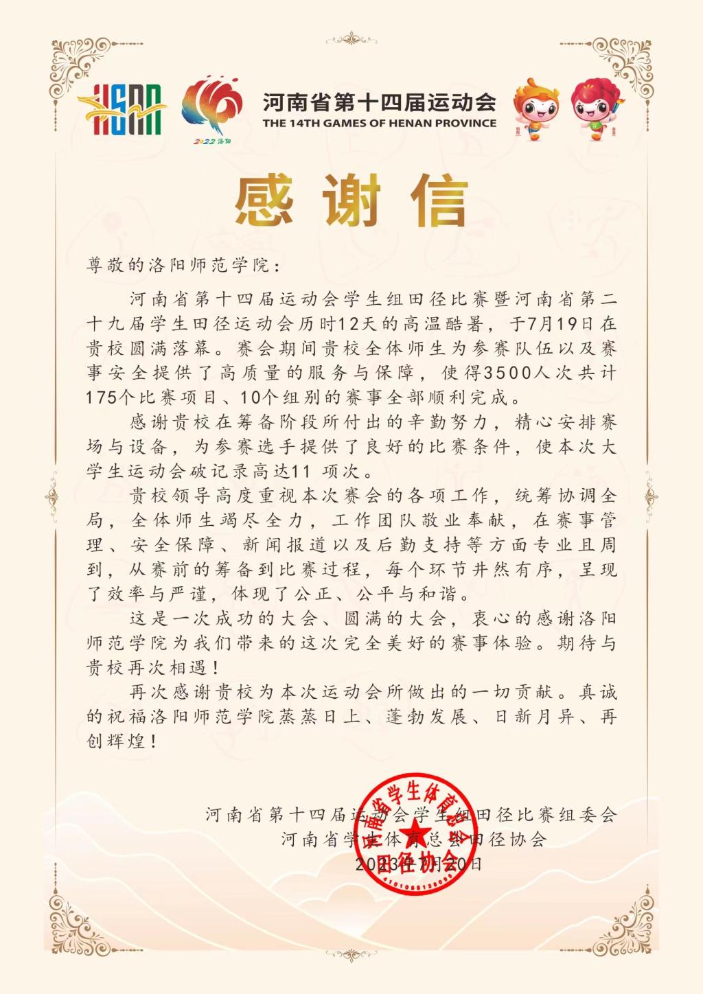 7月20日,河南省第十四届运动会学生组田径比赛组委会、河南省学生体育总会田径协会向米兰app官方端网站入口发来感谢信,感谢米兰app官方端网站入口对河南省第十四届运动会学生组田径比赛暨河南省第二十九届学生田径运动会的鼎力支持和倾力奉献。