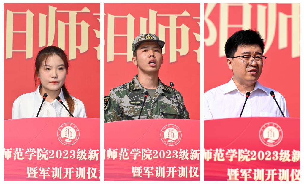 新生代表、马克思主义学院2023级学生赵铭格代表全体新生表示要怀揣梦想和热情,迎接大学生活的挑战,争做有理想、有本领、有担当的新时代青年。退役大学生代表、体育学院2021级学生任华鹏,以自身的军旅经历为例,激励同学们要珍惜军训这一堂国防教育课,增强国防观念,发扬革命精神,积极调节心态,快速适应生活。教师代表、国土与旅游学院曹威威博士结合个人经历,勉励同学们要在波澜壮阔的时代洪流中,找到属于励志者、奋斗人、实干家的位置,成就人生的辉煌。