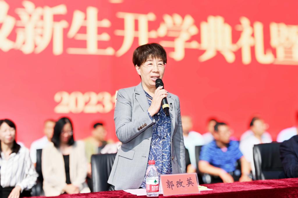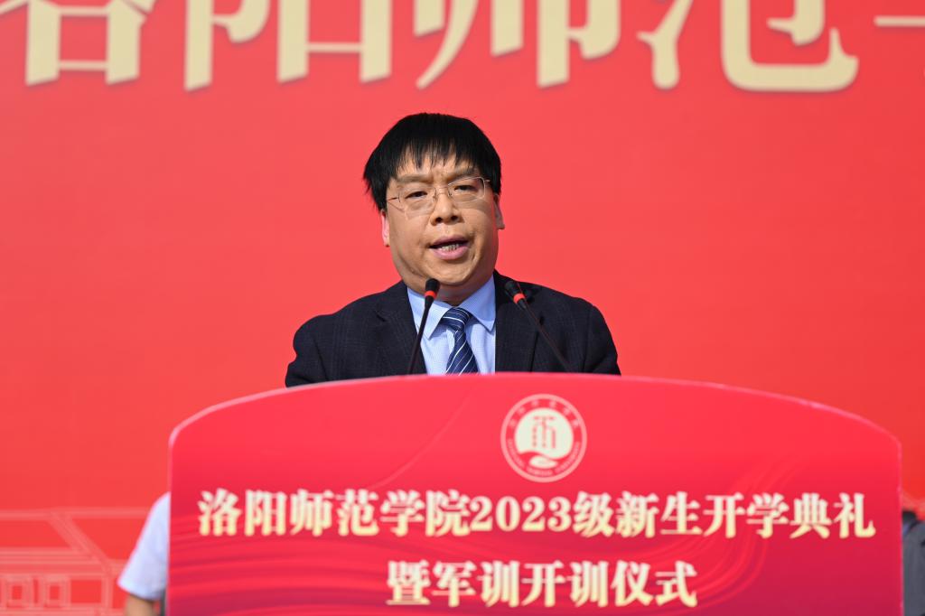 郭海明代表学校向全体新同学表示热烈的欢迎和衷心的祝贺,介绍了学校的办学历史、校园建设、内涵发展等情况,向全体新生提出四点希望:一是胸怀祖国、志存高远,做崇高理想的信仰者。要珍惜这个伟大的时代,坚定理想信念,高扬理想之帆,树立远大志向,与祖国同行、与时代同行、与奋斗同行。二是明德求真、立身修为,做诚信美善的践行者。要自觉树立和践行社会主义核心价值观,不断锤炼品德修为、提升道德素养、涵养人生的境界和格局。三是脚踏实地、团结奋进,做终身学习的示范者。要多读书、勤发问,保有好奇心、怀有质疑精神,善于思考、勇于探索、敢于创新,将自己的专业学习与社会经济发展、国家民族复兴联系起来,养成终身学习的习惯,持之以恒练就过硬本领、磨砺坚强意志,让勤奋学习成为青春远航的动力,让增长本领成为青春搏击的力量。四是担当作为、守正创新,做强大中国的筑梦者。要学会批判分析和独立判断,勇于探索未知领域,扩大自己的认知边界,紧随国家和时代的发展脚步,把自己的聪明才智融入到中华民族伟大复兴的时代洪流中去,在经风雨、见世面中长才干、壮筋骨,在担当作为中练就硬脊梁、铁肩膀、真本事,在洛师百年文化传承中汲取营养,奋力书写“请党放心、强国有我”的时代答卷,创造出彰显青春风采的人生华章。