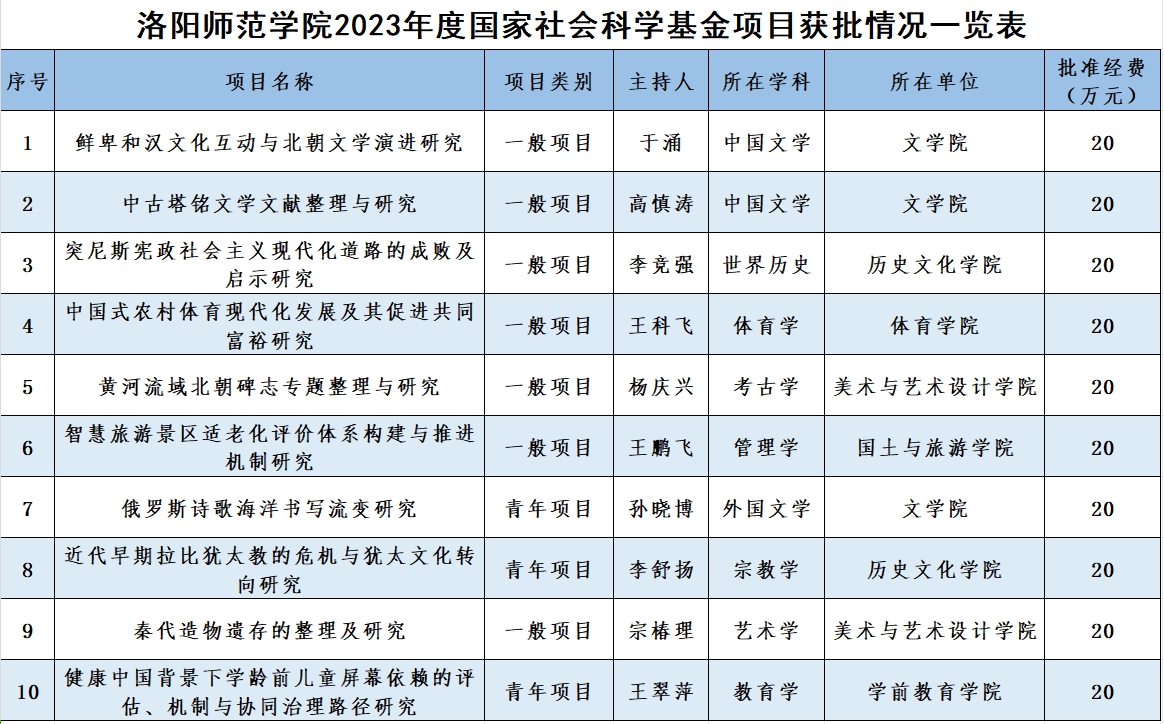 日前,全国哲学社会科学工作办公室先后发布2023年国家社会科学基金教育学项目、年度项目、青年项目、艺术学项目评审结果,米兰app官方端网站入口共有10个项目获得立项资助,包括一般项目7项,青年项目3项。截至目前,项目经费资助总额200万元,立项数量位列河南省高校第4位,资助经费较去年同期增长66.6%。