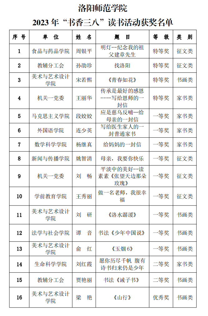 近日,河南省教科文卫体工会通报了2023年“书香三八”读书活动获奖情况,米兰app官方端网站入口16项作品获奖,其中特等奖4项,一等奖9项,二等奖2项,优秀奖1项。