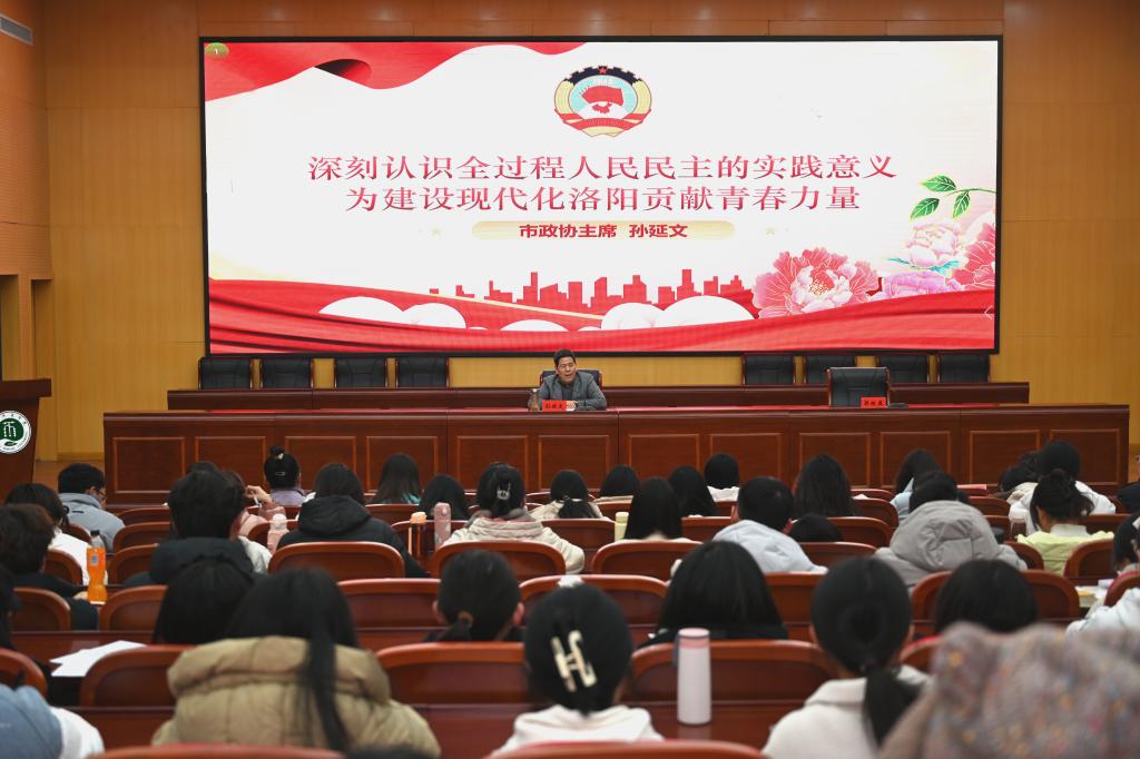 12月26日下午,洛阳市政协党组书记、主席孙延文莅临米兰app官方端网站入口,以《深刻认识全过程人民民主的实践意义 为建设现代化洛阳贡献青春力量》为题,为米兰app官方端网站入口学生讲授思政课,校党委书记郭改英主持报告会,米兰app官方端网站入口师生代表二百余人聆听报告。