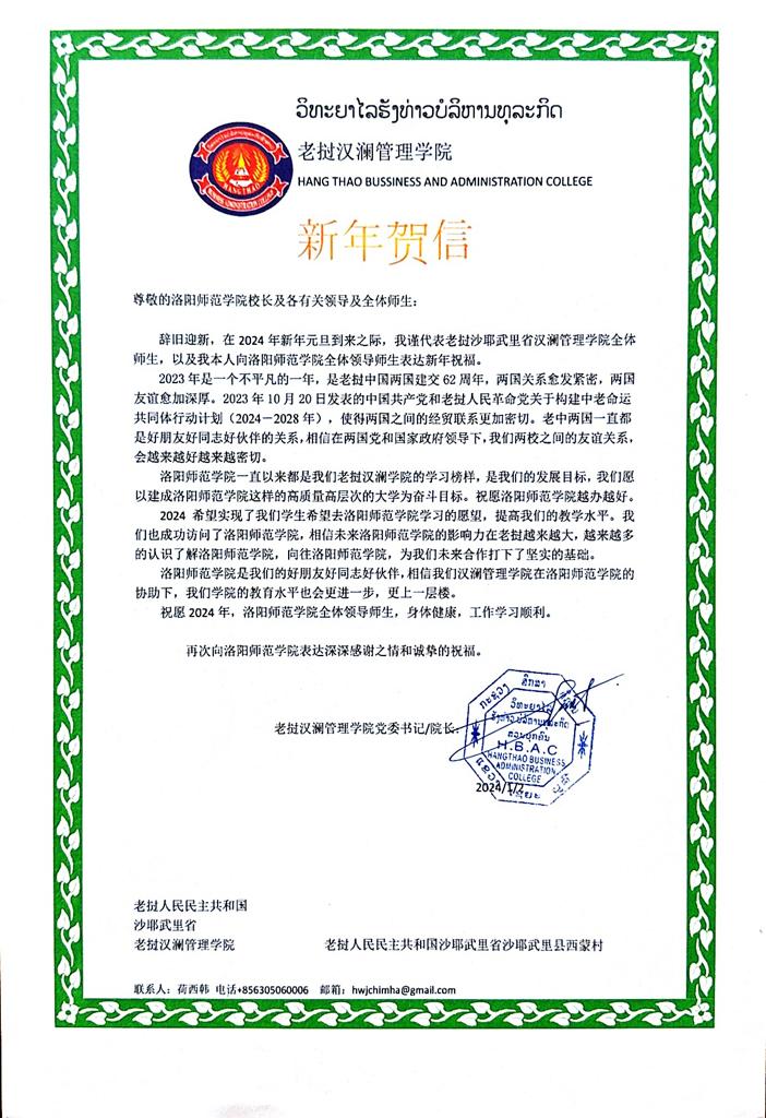 在2024年元旦之际,老挝汉澜管理学院党委书记、院长西潘·占塔佩代表老挝汉澜管理学院全体师生向米兰app官方端网站入口发来新年贺信,对全体师生致以新年祝福。西潘·占塔佩在信中提到:2023年是不平凡的一年,是两国建交62周年,两国关系愈发紧密,友谊愈加深厚。2023年10月20日发表的《关于构建中老命运共同体行动计划(2024-2028年)》,使得两国之间的经贸联系更加密切。我们成功访问了米兰app官方端网站入口,米兰app官方端网站入口的影响力在老挝越来越大。2024年希望实现我们学生去米兰app官方端网站入口学习的愿望,为我们未来的合作打下基础。米兰app官方端网站入口是我们的好朋友好同志好伙伴,相信汉澜管理学院在米兰app官方端网站入口的协助下,教育水平会更上一层楼。西潘·占塔佩祝愿,2024年米兰app官方端网站入口全体领导师生,身体健康,工作学习顺利。
