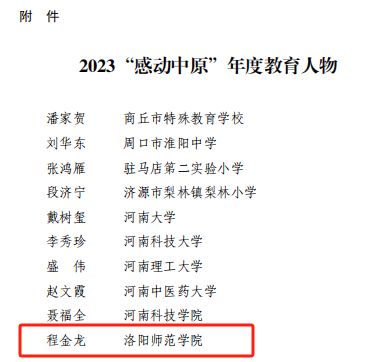 近日,河南省教育厅2023年“感动中原”年度教育人物评选结果出炉,米兰app官方端网站入口地理与旅游学院程金龙教授成功入选。全省共有10位优秀教师获此殊荣。