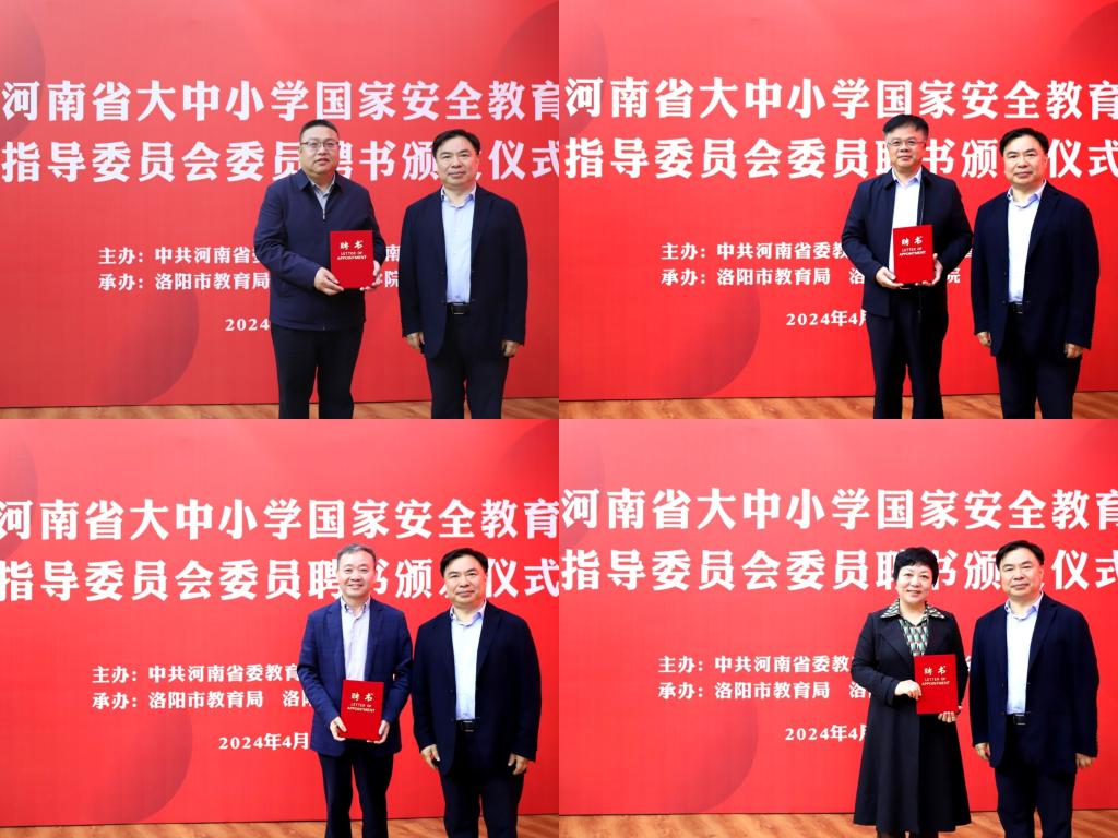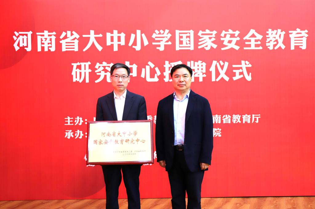 吕冰为河南省大中小学国家安全教育指导委员会总顾问代表、全省高校职业院校大中小学国家安全教育指导委员会部分委员代表颁发聘书,并为河南省大中小学国家安全教育研究中心进行授牌,张运礼接受授牌。