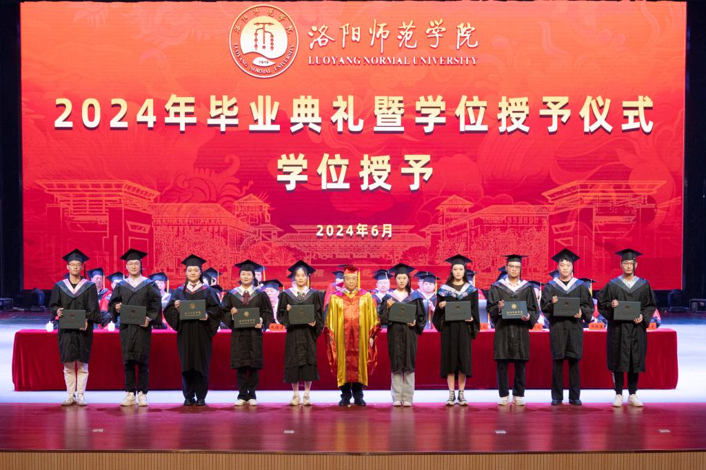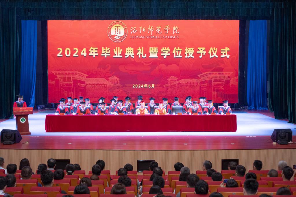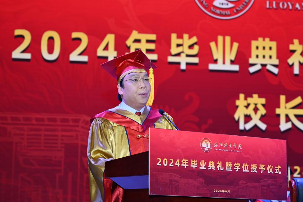 郭海明首先对2024届毕业生顺利完成学业表示祝贺,回顾了同学们在洛师学习生活中的收获与成长。他谆谆寄语毕业生,希望同学们胸有“大志”,做有理想的新时代好青年,练就“不畏浮云遮望眼”的慧眼,保持“咬定青山不放松”的定力,厚植“愿得此身长报国”的情怀;心怀“大我”,做敢担当的新时代好青年,以永不懈怠的精神状态、永不停滞的奋进姿态,永不自满的向上心态,努力成长为可堪大用、能担重任的栋梁之才;肩扛“大任”,做能吃苦的新时代好青年,继承和发扬老一辈不怕吃苦的精神,摒弃骄娇二气,努力创造无愧青春、无愧时代的优秀业绩;脚行“大道”,做肯奋斗的新时代好青年,时刻坚守强国志向、练就过硬本领,以实干书写人生,用奋斗镌刻荣光。