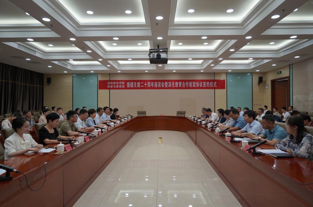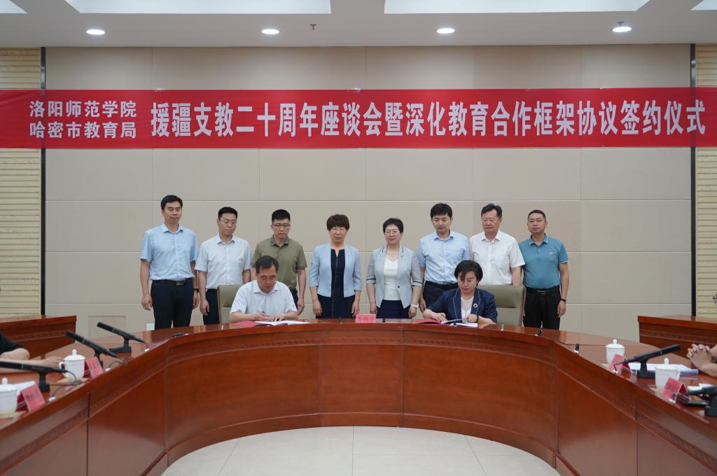 郭改英在讲话中指出,治疆是国之大事,援疆是国之要略。学校深入学习领会习近平总书记重要指示精神和新时代党的治疆方略,认真贯彻落实河南省委省政府、省委教育工委和省教育厅关于做好河南对口援疆工作的部署要求,始终把教育援疆工作作为一项重大政治任务,聚焦铸牢中华民族共同体意识,矢志不渝、坚定不移把“为党育人、为国育才”的初心使命写在边疆大地上。自2005年开始,学校立足自身优势,积极主动与哈密对接开展援疆工作,形成了以教育援疆为主线,教育援疆、科技援疆、人才援疆、文化援疆“四位一体”的援疆工作模式,为哈密教育事业和经济社会发展,为助力新疆社会稳定和民族团结进步作出了积极贡献。通过教育援疆,极大增进了学校与哈密师生思想上的共鸣,情感上的交融,文化上的认同,发展上的共赢;二十年的援疆经验,也为学校完善人才培养方案、创新人才培养模式、深化教育教学改革提供了鲜活的实践经验。