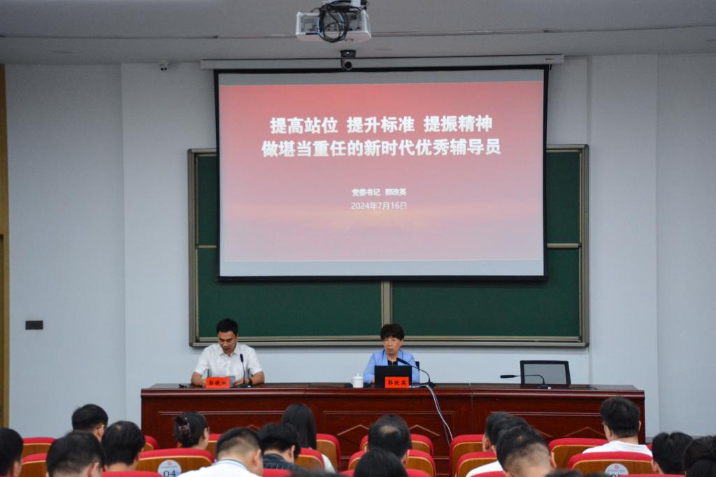 就全面提升辅导员素质能力,郭改英强调:一要提高站位,充分认识辅导员岗位的特殊重要性。辅导员是学生政治思想的“引领者”、学业成长的“指导者”、心理健康的“守护者”、日常生活的“服务者”,要强化“以学生为中心”的理念,践行“为学生服务”的宗旨,做到“三个一切”!二要提升标准,不断提高辅导员工作职业化专业化水平。要筑牢信仰之基,持续加强政治能力建设;要担好育人之责,准确把握思想政治工作规律,遵循学生成长规律,推动思政教育守正创新;要勤修仁爱之心,在学生工作中收获成长、收获快乐;要绷紧纪律之弦,在学纪、知纪、明纪、守纪上做表率。三要提振精神,在推进学校高质量发展中彰显辅导员队伍的责任和担当。她表示,学校党委高度重视辅导员队伍建设,始终关心关爱辅导员的成长发展,出台一系列制度文件和具体措施,做到了工作有条件、干事有平台、待遇有保障、发展有空间,使辅导员真正成为让人羡慕、有发展前途的岗位。