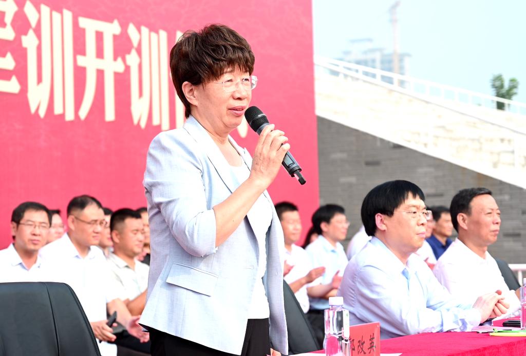 在铿锵的乐曲声中,郭改英向军训总教官杨虎授旗,并宣布军训开训。