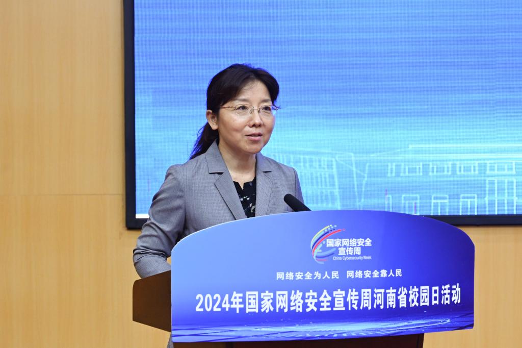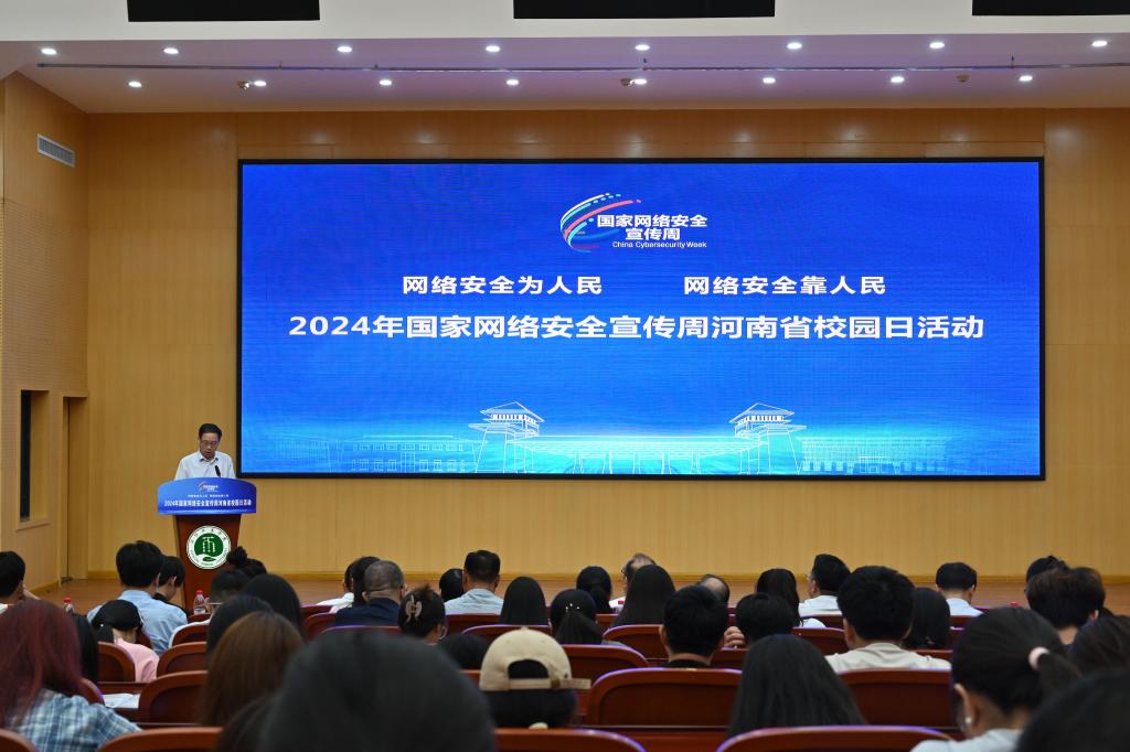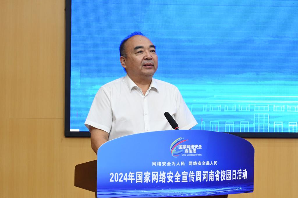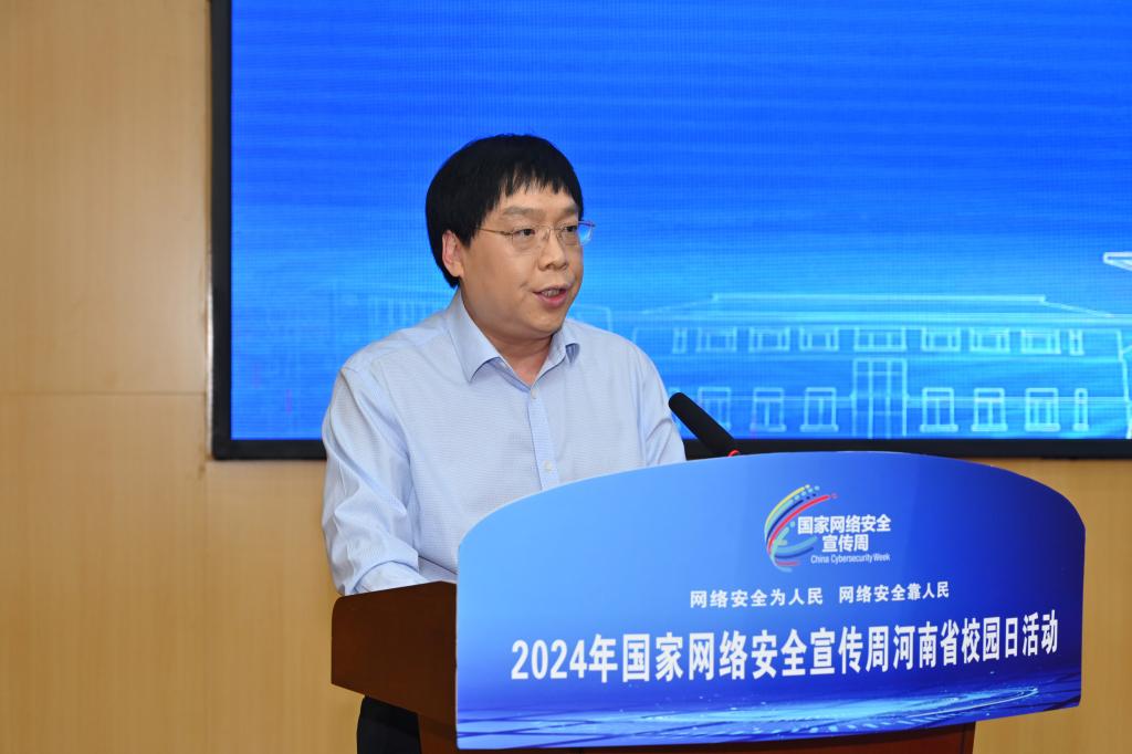 郭海明首先简要介绍了学校高度重视网络安全和信息化工作的基本情况。他表示,学校将以此次活动为契机,深入贯彻落实党的二十届三中全会中关于“健全网络综合治理体系”的部署要求,强化规范引领,不断健全完善校园网络生态治理长效机制,让网络更好的服务师生、护航学校高质量发展;常态化、多主题、创新性开展网络安全教育,引导广大师生争做网络安全的忠实捍卫者,共筑校园清朗网络空间;积极发挥河南省大中小学国家安全教育研究中心平台的智库作用和学校信息技术、法学等学科专业优势,为网络安全建设提供智力支持和人才支撑,为推进网络强省建设作出新的更大贡献。