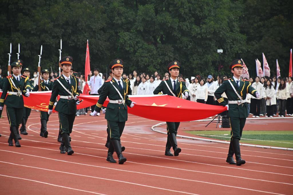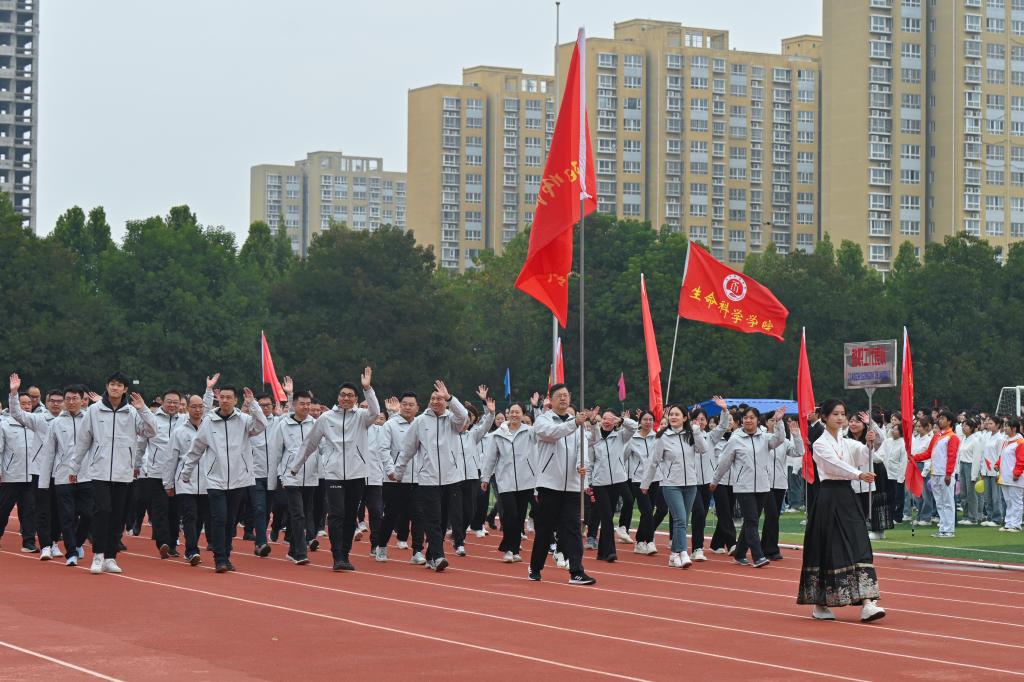 伴随着雄壮的国歌,国旗班护送着中华人民共和国国旗率先步入会场,拉开了运动会的序幕。在昂扬的《运动员进行曲》中,彩旗队、各学院运动员方阵、教职工代表队依次经过主席台接受检阅,整齐划一的动作、饱满的精神状态,不时赢得全场师生的阵阵掌声。