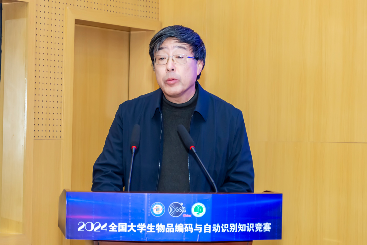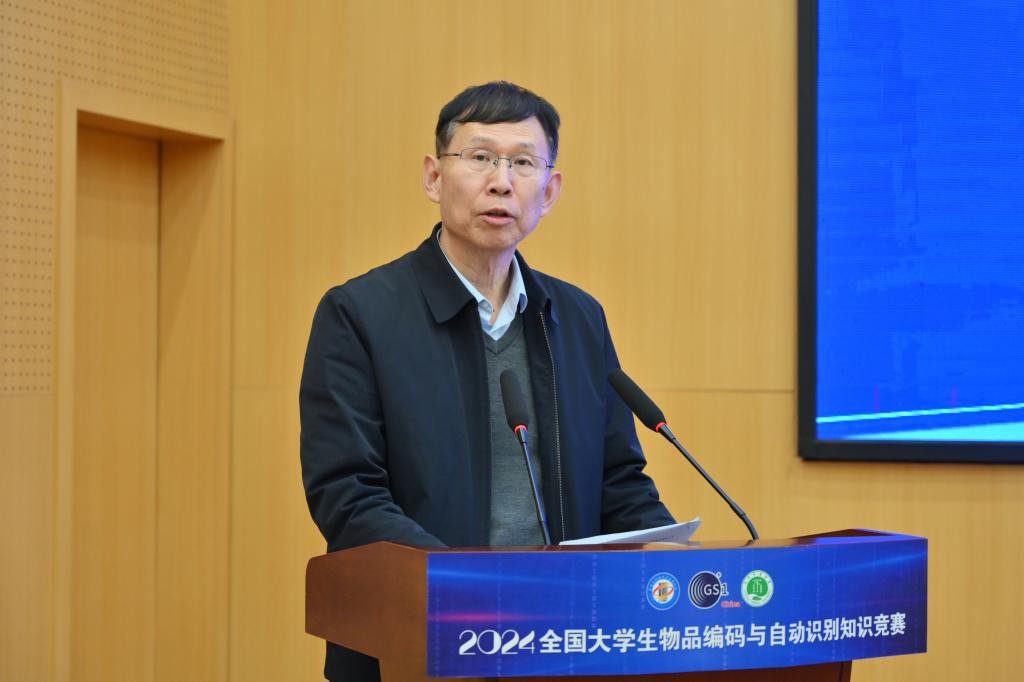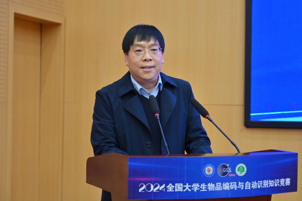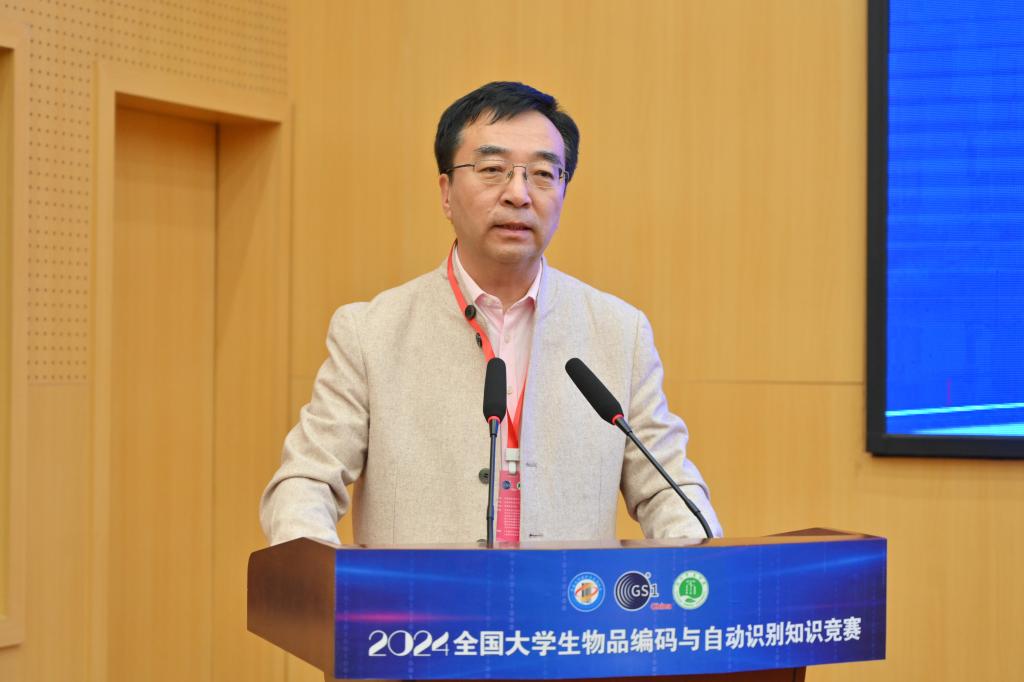 郭海明致辞,他首先介绍了学校的基本情况,并表示举办全国大学生物品编码与自动识别知识竞赛是落实国家加强标准化人才培养相关要求的生动实践,也是引领高校物品编码、自动识别技术与相关专业课程体系建设的重要抓手,学校将以承办全国大学生物品编码与自动识别知识竞赛为契机,进一步加强与高校、协会和企业的沟通协作,深化资源共享,为条码及自动识别应用行业领域输送更多的高素质复合型人才,为“数字中国”建设贡献力量。