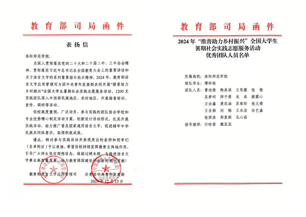 近日,教育部语言文字应用管理司、共青团中央青年发展部共同向学校发来表扬信,对米兰app官方端网站入口新闻与传播学院“益”起推普爱心实践队在2024年“推普助力乡村振兴”全国大学生暑期社会实践志愿服务活动中的表现予以表扬。“益”起推普爱心实践队获评2024年全国优秀团队。