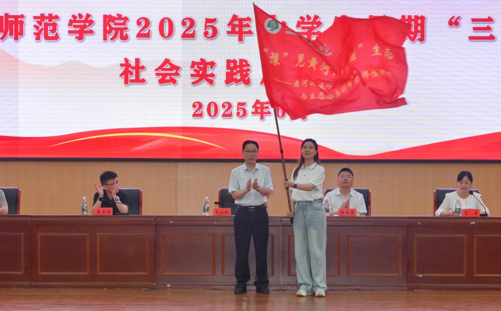 张运礼为社会实践重点团队代表授旗。他对同学们提出三点希望:一要胸怀“国之大者”,将“小我”融入“大我”,在基层实践中厚植家国情怀;二要坚持知行合一,将课堂所学与社会所需紧密结合,在服务社会中锤炼过硬本领;三要勇担时代使命,主动投身乡村振兴主战场、基层治理第一线、民生服务最前沿,在艰苦奋斗中绽放青春光彩。