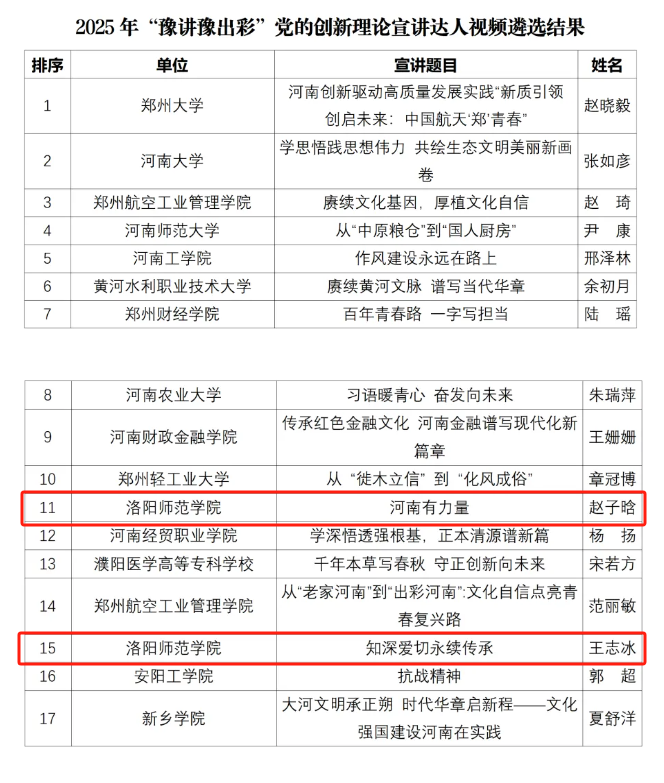 近日,由河南省教育厅遴选的“豫讲豫出彩”党的创新理论宣讲达人专家库名单揭晓,全省高校有45名同志入选,米兰app官方端网站入口马克思主义学院教师王志冰、龙门书院2号学生社区辅导员赵子晗成功入选。