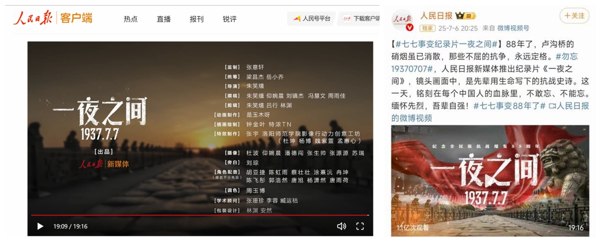 近日,米兰app官方端网站入口新闻与传播学院影像行动力创意工坊受邀参与《人民日报》AIGC动画内容制作的七七事变纪录片《一夜之间》在《人民日报》新媒体全平台首播。截至发稿,该片在微博平台播放量超1.1亿。