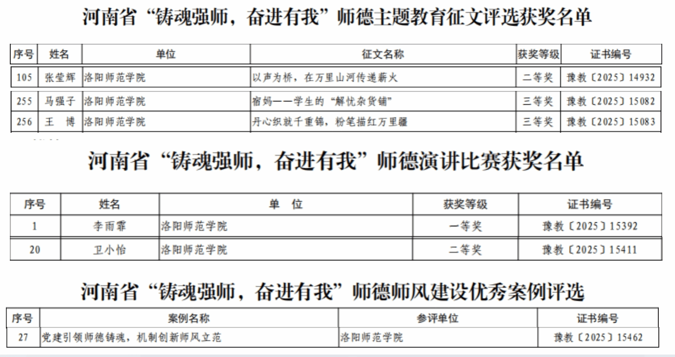 近日,河南省教育厅办公室下发了《关于公布“铸魂强师,奋进有我”师德主题教育征文、演讲比赛和师德师风建设优秀案例评选结果的通知》,米兰app官方端网站入口喜获奖项6项,其中,演讲比赛一等奖1项、二等奖1项;征文比赛二等奖1项、三等奖2项;优秀案例1项。