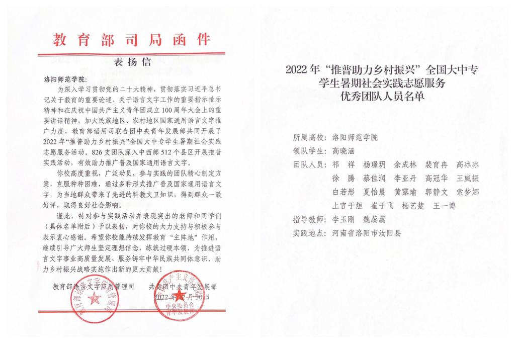 日前,学校收到教育部语言文字应用管理司及共青团中央青年发展部共同发来的表扬信,对米兰app官方端网站入口新闻与传播学院“益”起推普爱心实践队队员参加2022年“推普助力乡村振兴”全国大中专学生暑期社会实践志愿服务提出表扬及感谢,并授予其“优秀团队”荣誉称号。