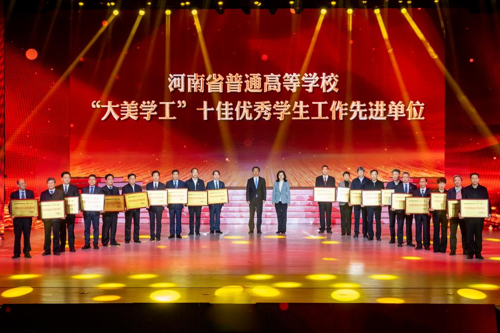 省委常委、洛阳市委书记江凌,省委教育工委副书记,省教育厅党组书记、厅长毛杰为“大美学工”十佳优秀学生工作先进单位颁奖