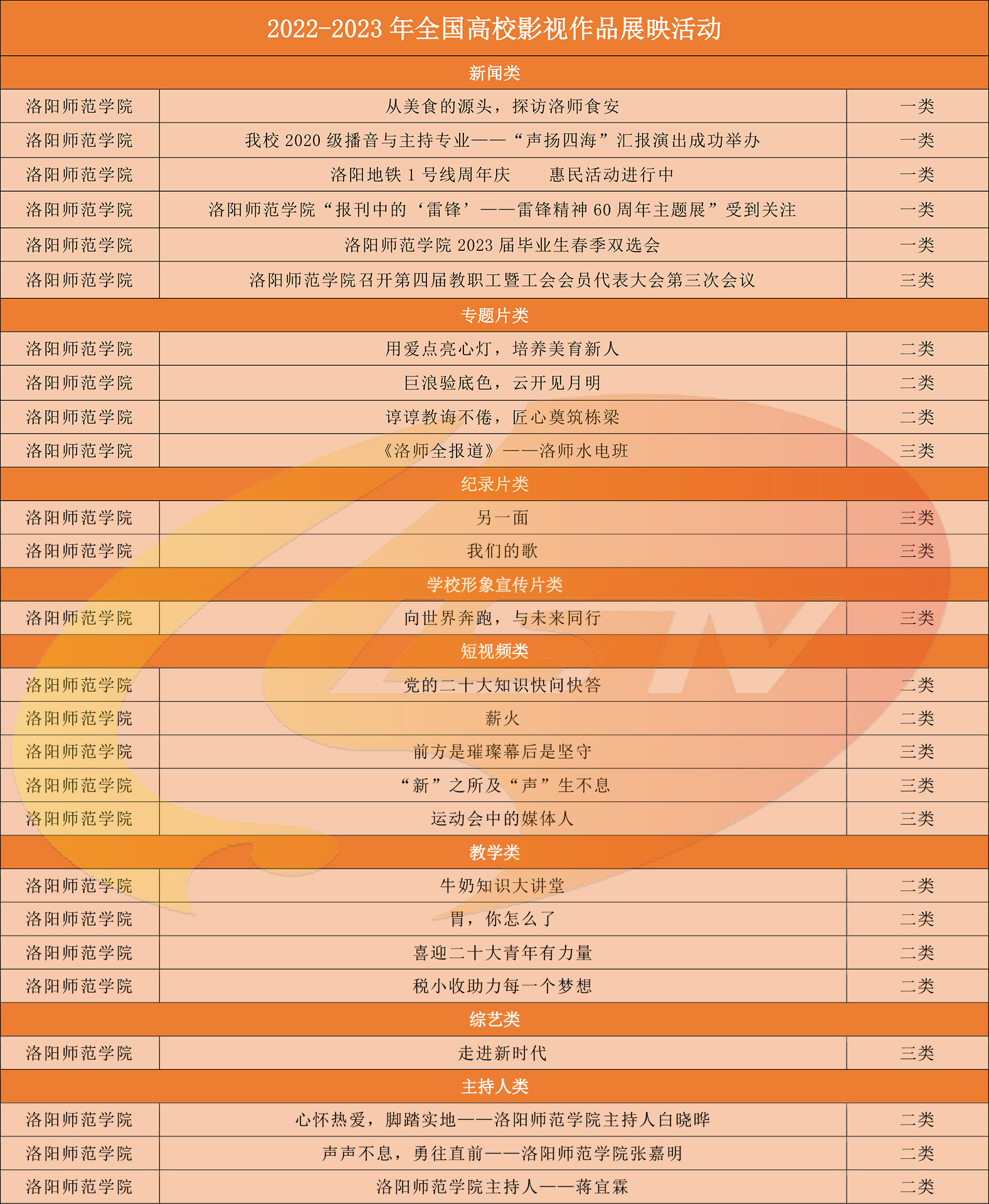 其中,《“报刊中的‘雷锋’——雷锋精神60周年主题展”受到关注》等5部新闻作品荣获新闻类一等奖;《用爱点亮心灯培养美育新人》等三部作品荣获专题类二等奖;《米兰app官方端网站入口召开第四届教职工暨工会会员代表大会第三次会议》获得新闻类三等奖;《洛师全报道——洛师水电班》获专题类三等奖;《另一面》《我们的歌》获纪录片类三等奖;《向世界奔跑 与未来同行》获学校形象宣传片类三等奖;共获短视频类二等奖、三等奖四项;教学类二等奖四项;综艺类作品获奖一项;主持人类二等奖三项。