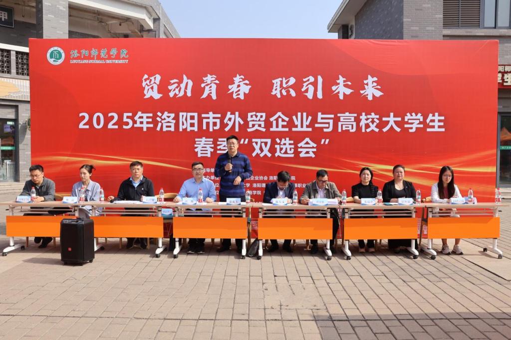 洛阳市商务局局长陈天文致辞。他表示,本次双选会是政校企三方联动的重要举措,旨在为洛阳外贸企业输送高素质人才,同时助力毕业生实现更充分、更高质量的就业。