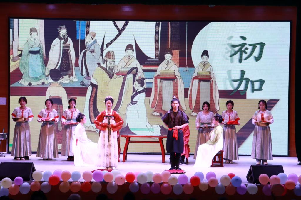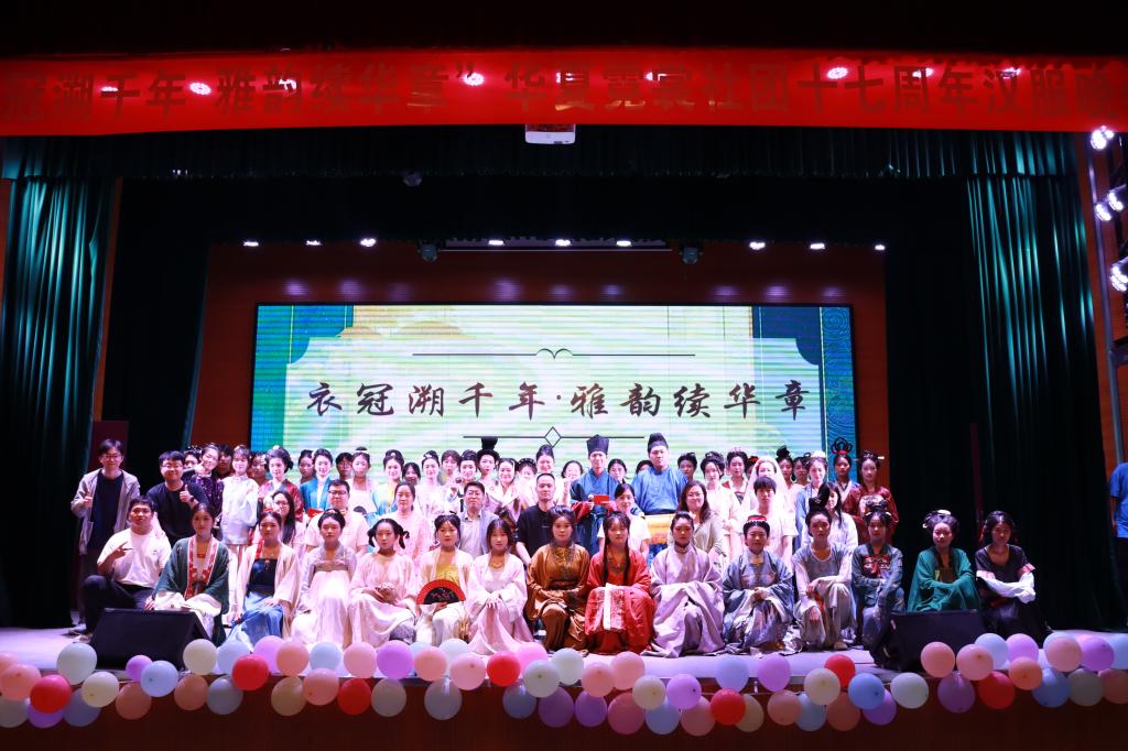 晚会在乐器演奏《霍元甲》中拉开帷幕。舞蹈《书简》中舞者衣袂翩然,手持书卷腾挪辗转,水袖翻飞间,勾勒出文人雅士以书会友的诗意场景,把古典意蕴化作灵动舞姿;《礼仪·成人礼》借庄重典雅之冠礼、笄礼,于观众眼前徐徐铺展礼乐文明的璀璨画卷,少年束发为冠,少女簪缨加笄,在礼乐声中完成生命的庄重蜕变;《唐俑》采用文物复原的方式把文物带上舞台,真正“让收藏在博物馆里的文物、陈列在广阔大地上的遗产、书写在古籍里的文字都活起来”,当珍藏于各大博物馆的画卷徐徐展开,五位姿态各异的少女在一颦一笑中尽显大唐风采;古筝独奏《大鱼》琴音空灵,似海浪翻涌,带观众遨游神话意境;短剧《琵琶行》将观众拉回浔阳江头的那个夜晚,再现了唐代社会的风貌与历史情感,传承华裳与经典文化之美;舞蹈《寄明月》将流行元素融入汉服文化,青春韵律里,展现传统与现代的奇妙碰撞;走秀《衣脉·越千年》以汉服形制演变为脉络,直裾、深衣、襦裙、褙子、马面裙等依次登场,表演者身着不同朝代代表性汉服走秀,搭配历史解说,清晰勾勒出华夏衣冠的发展轨迹,服饰色彩从古朴到绚丽,款式从简约到繁复,无声诉说时代变迁与文化传承。社团倾情放送的彩蛋《盛唐夜唱》将全场气氛推向高潮。