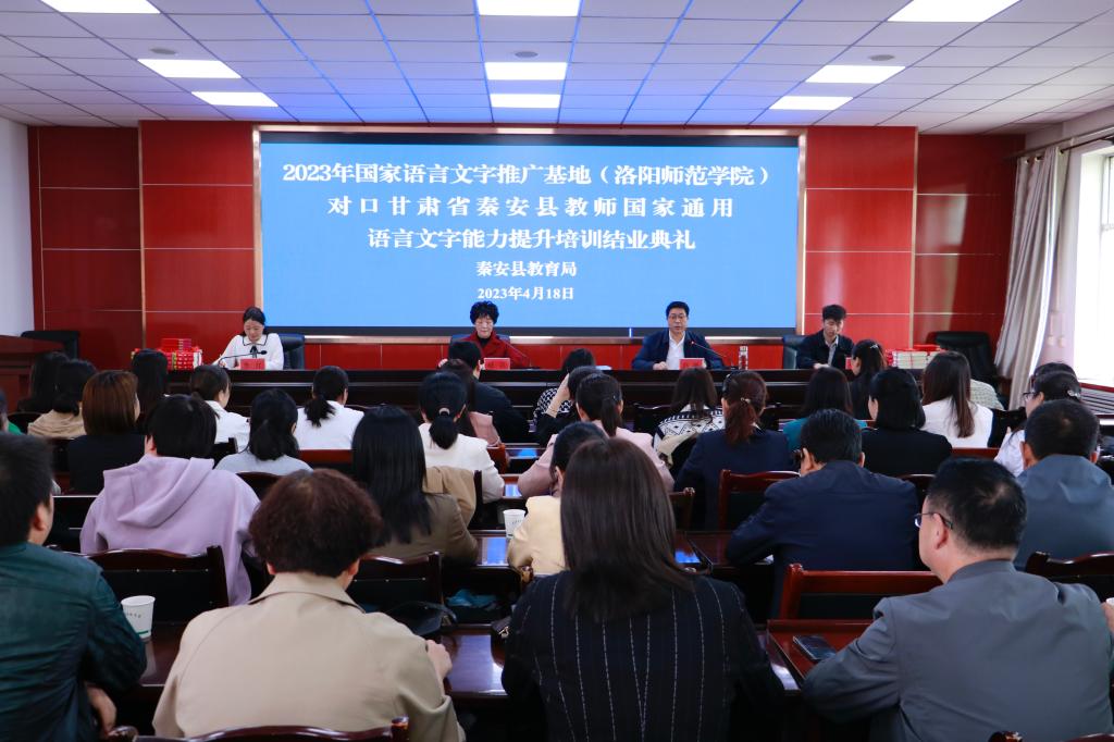 4月18日上午,米兰app官方端网站入口对口甘肃省秦安县教师国家通用语言文字能力提升培训结业典礼在秦安县教育局会议室举行。典礼由秦安县教育局党组成员、副局长高鹏主持,国家语言文字推广基地(米兰app官方端网站入口)教学团队、秦安县教育局相关人员及60余名学员参加了活动。